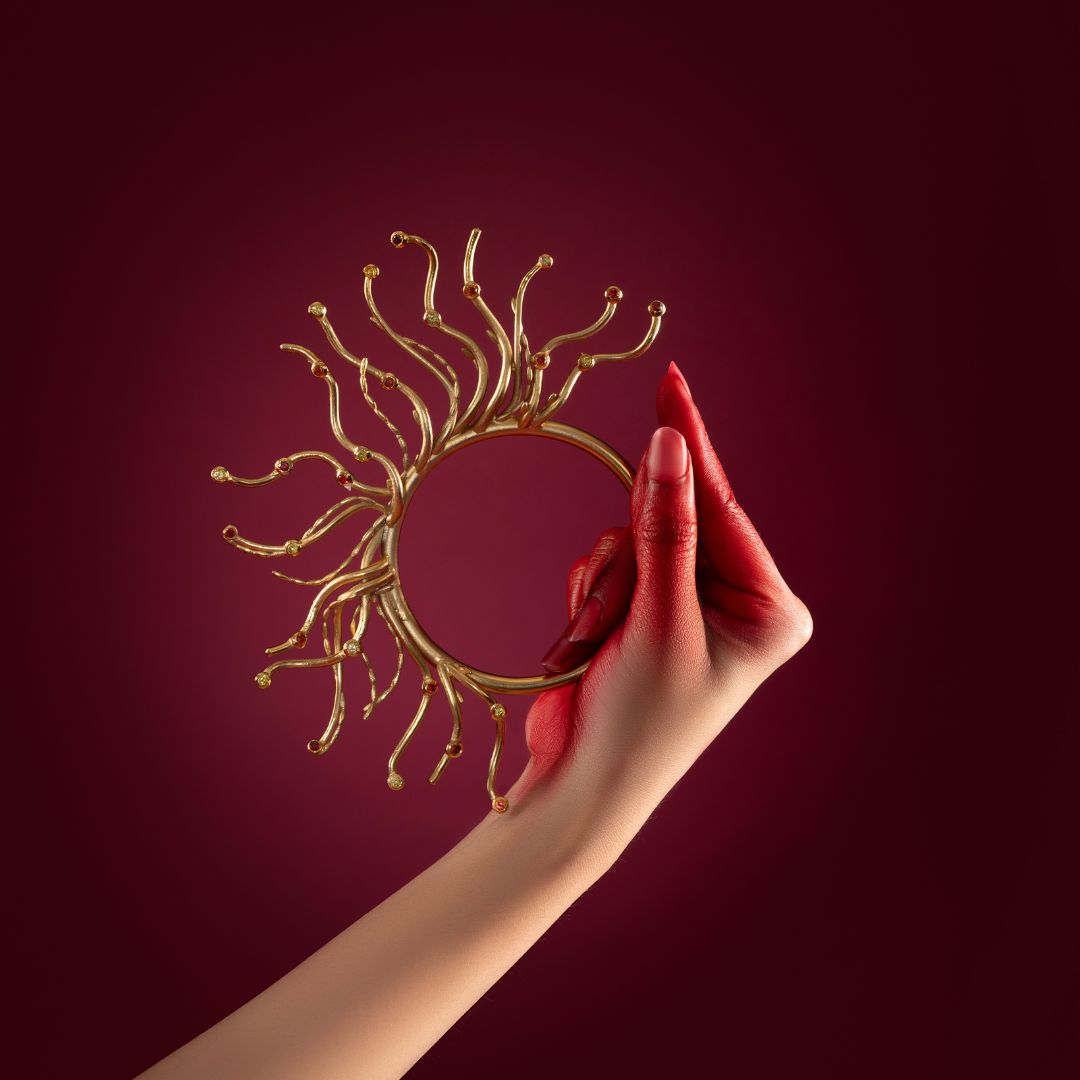 This headpiece carries the tranquility of a landscape at dusk: one can imagine the sky painted in vermilion tones and feel the hush that falls over ripening fields. More than an accessory, it is a statement of identity and intent.