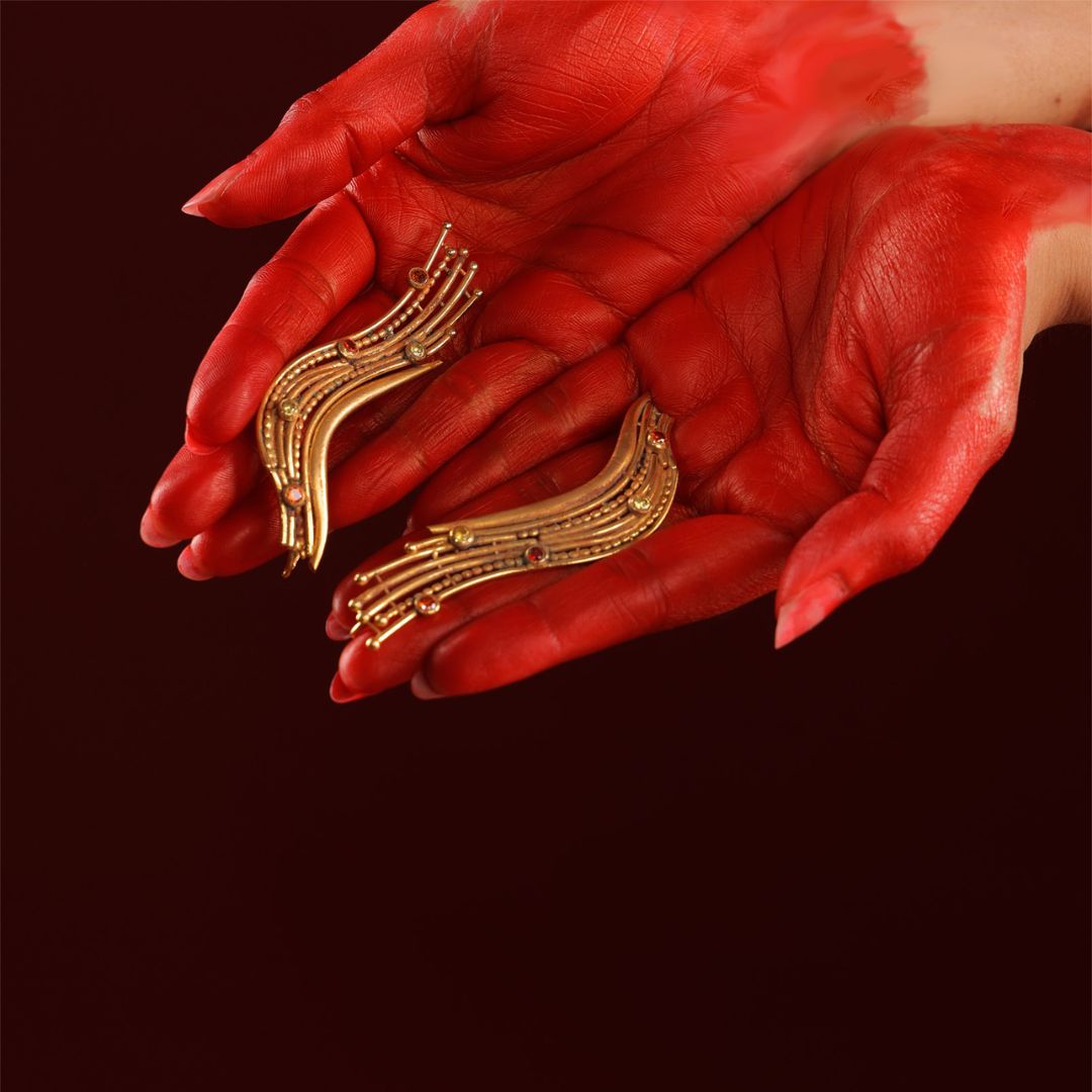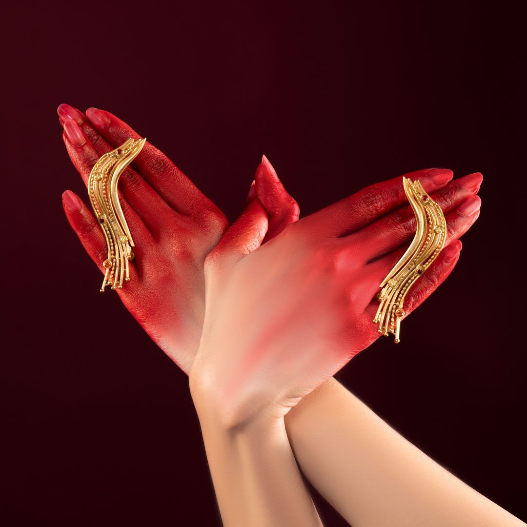 Handcrafted in sterling silver with 18K gold plating and adorned with semi-precious gemstones, their fluid silhouette is punctuated with warm-toned stones glinting like ripe grains of rice at harvest symbols of prosperity born from patience. Airy yet grounded, the design feels like a graceful gesture suspended in motion, embodying rhythm, restraint, and renewal.